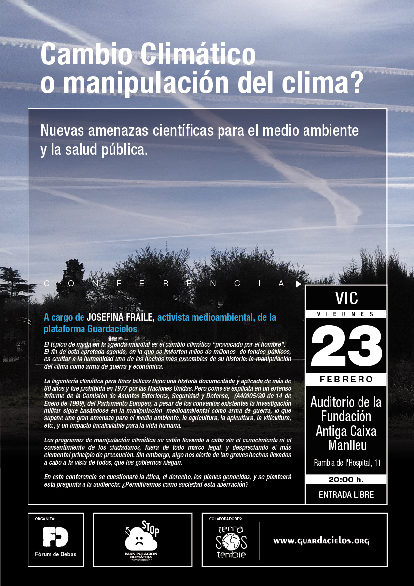 En esta conferencia se analizará cómo uno de los tópicos de moda en la agenda mundial es el cambio climático “provocado por el hombre”. El fin de esta apretada agenda, en la que se invierten miles de millones de fondos públicos, en opinión de la ponente, es ocultar a la humanidad uno de los hechos más execrables de su historia: la manipulación del clima como arma de guerra y económica.