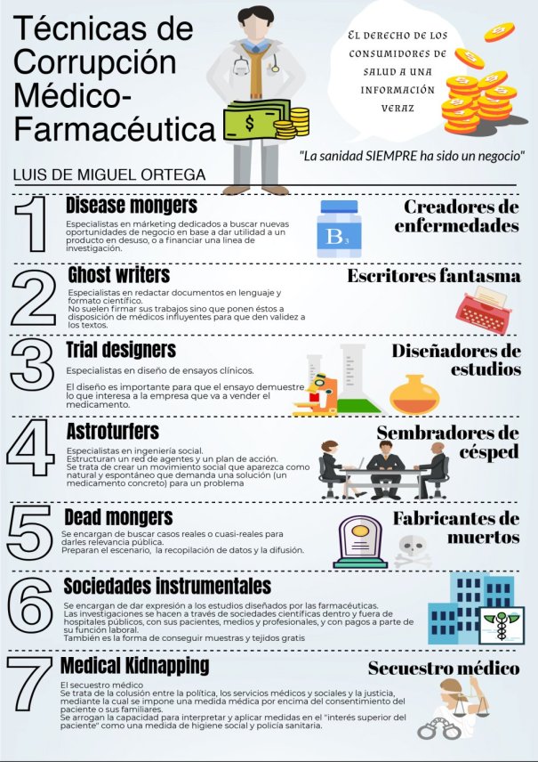 En una primera parte de la conferencia, hablaremos sobre lo que es la corrupción médico-farmacéutica y las técnicas más conocidas (Disease mongers, Trial designers, Astroturfers, dead mongers, sociedades instrumentales y medical kidnapping), poniendo ejemplos claros y reales de todos ellos.
