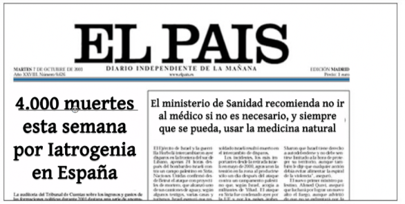 Se hace difícil de entender que sigan intentando imponer la medicina alopática y farmacológica cuando el propio Senado de los EEUU ha aceptado que la cantidad de muertes anuales en ese país por actuaciones médicas evitables (o sea, por iatrogenia) es de 400.000. Más de 1.100 muertes cada día sólo en EEUU por errores médicos. Más que por infartos, por cáncer, por accidentes de tráfico… por violencia de género… En Europa no hay datos oficiales, pero las cifras rondan las 200.000 muertes al año… Son cifras controvertidas y nadie se pone deacuerdo. ¿Cómo admitir tal contradicción por parte de la ciencia médica? Y en todo caso, ¿Por qué no aparecen estas cifras en los titulares todos los días en lugar de otras causas de muertes que sí aparecen… todos los días? ¿Cuando veremos titulares como estos en nuestra estimada prensa?